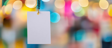 A blank white tag mockup hangs in a colorful, vibrant store, ideal for sale promotions and festive offers.