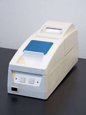 Open receipt printer for exchanging the thermal paper roll, old and used printer on white isolated background with dirt and grunge, connected to a cash register