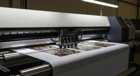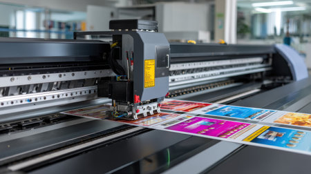 Advanced printing machinery works meticulously in a manufacturing plant. Color inkjet technology creates vivid designs on material, showcasing innovation and efficiency in production