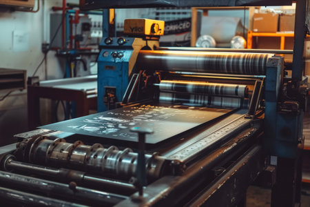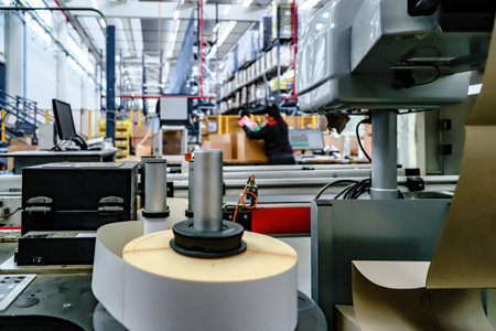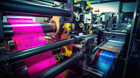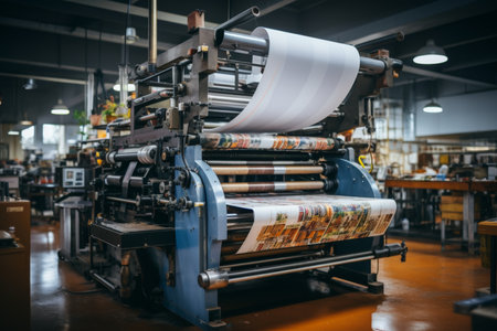 Freshly printed pages running through printing press, blurred printing shop with machines background