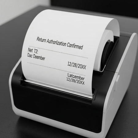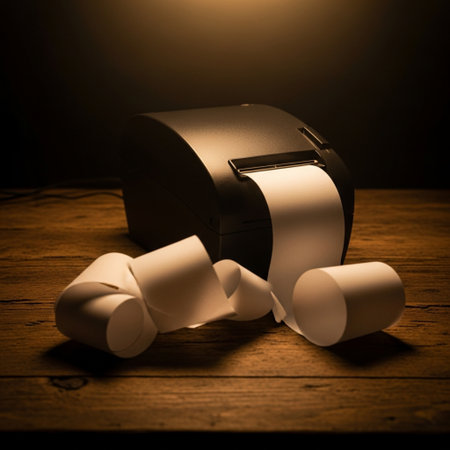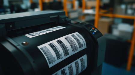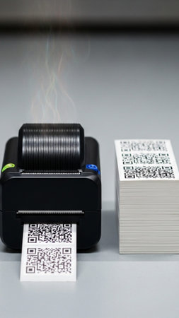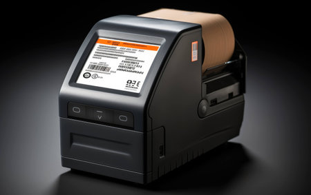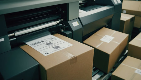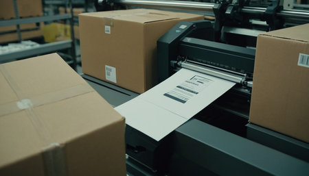 In a warm workspace, a thermal printer emits a newly printed shipping label, ready to be affixed to a small cardboard box, illustrating efficient packing and dispatching efforts.