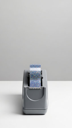Vertical (9:16) high-resolution editorial photograph of a standard, weighty gray plastic tape dispen