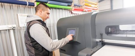 Printing house employee works on printing equipment