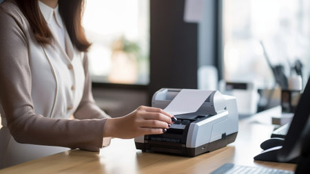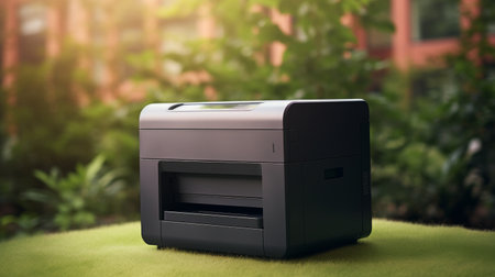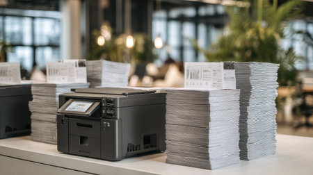 An elegant printer sits in a contemporary office, surrounded by neatly stacked printed papers and vibrant green plants, enhancing the workspace's productivity.