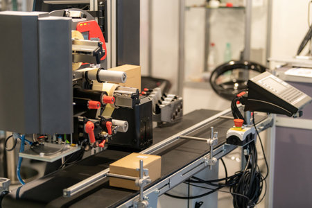 Close-up of cardboard boxes on a conveyor belt in a warehouse