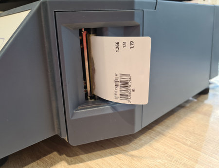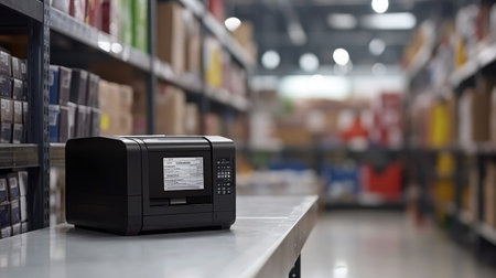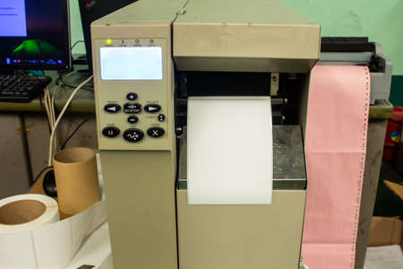 label sticker printer with paper retail beside cash drawer on business shop counter in technology concept