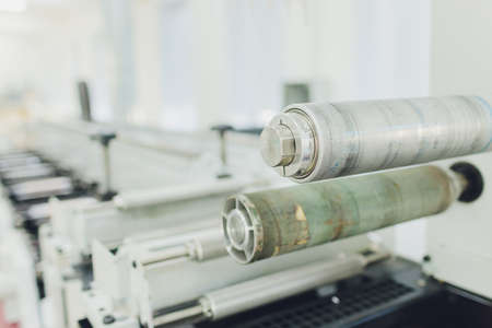 Traditional offset press. Printing in ink with CMYK, cyan, magenta, yellow and black. Graphic arts, offset printing. Detail of printing roller in offset machine of four bodies of black ink