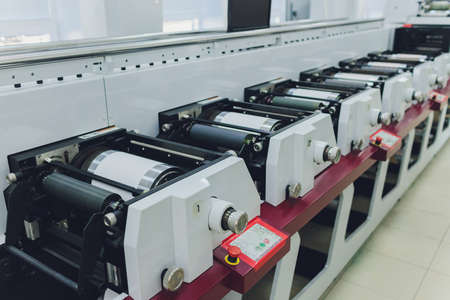 Industrial printing press machine producing large rolls of paper with printed material