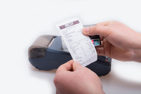 Hand holding online sales register machine with invoice, consept of small online business staying at home.