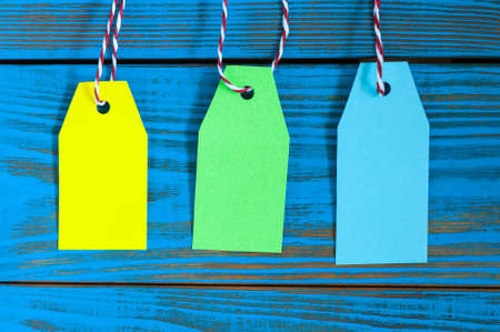 Empty brown paper tags tied with white string. Price tag, gift tag, sale tag on the blue background, close up