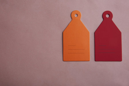 Two blank label mockup isolated on pink background. Plain empty name tag mock up with red and orange label. Top view. Horizontal