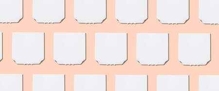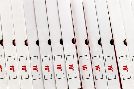 many packages of pizza on a light pastel background. Top view, flat lay. Banner.