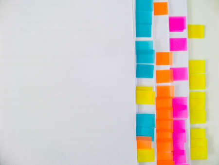 Open blank notebook with colorful sticky bookmarks on yellow paper, educational background concept border design with copy space