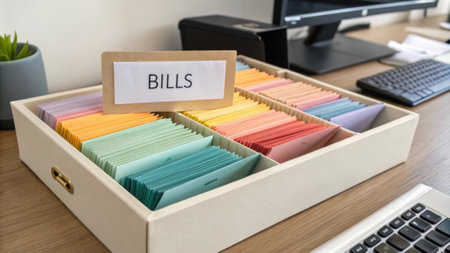 Bill Organizer A box labeled Bills filled with organized envelopes of different colored papers representing various expenses..