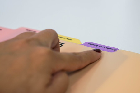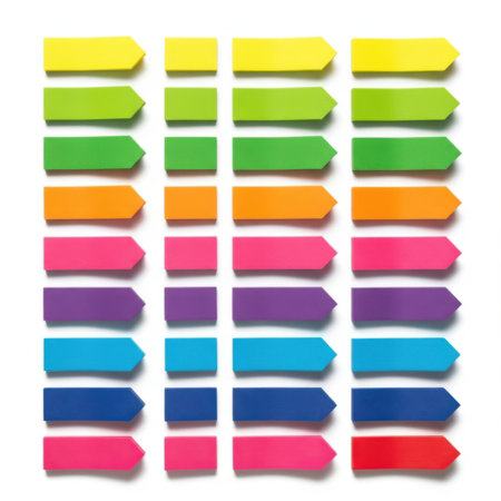 A vibrant arrangement of file tabs in various colors alongside a lined notepad on a desktop, showcasing an organized approach to office management and productivity.