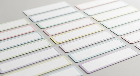 Numerous blank rectangular stickers with thin pastel borders in pink, blue, green, yellow, and purple are spread...