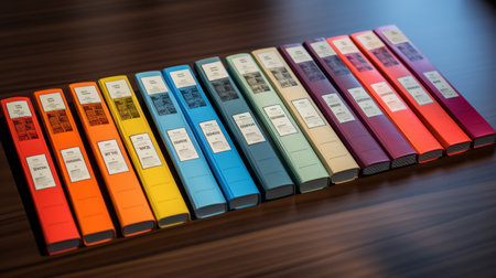 A vibrant file organizer showcases an array of colorful folders in a modern office environment. Ideal for enhancing productivity and organization, this image features a stylish backdrop that complements its sleek design.