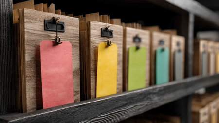 A close-up view of organized wooden shelves featuring colorful tags attached to file folders. This setup enhances workspace efficiency and organization.
