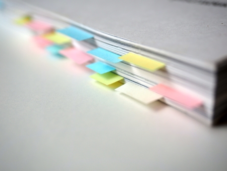 Colorful translucent sticky tabs marking organized stack of white paper sheets on bright stone surface in sunlight.
