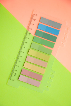 set of colorful sticky notes or paper tags and ruler on mint green notebook - selective focus