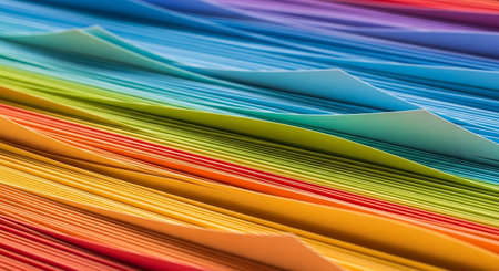 Abstract close-up of layered paper sheets in a rainbow spectrum creating a vibrant wavy pattern.