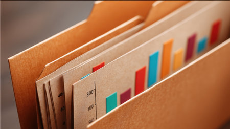 Organized file folder containing colorful bar graphs and charts, representing data analysis and business statistics. warm tones evoke sense of productivity and efficiency