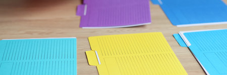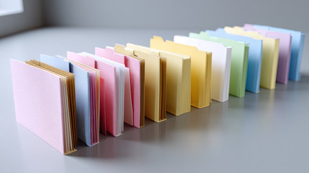 A vibrant collection of pastel-colored file folders arranged neatly on a modern office desk, perfect for showcasing organizational tools or creative workspace aesthetics.