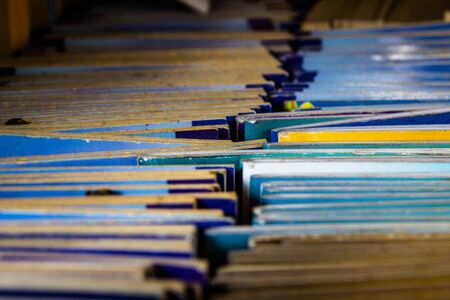 Bunch of colorful folders in a book store. Selective focus.