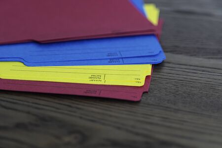 Close up view of a pile of colorful file folders. Selective focus.