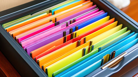 A vibrant array of colorful file folders neatly arranged in a desk drawer captures the essence of organization and efficiency in any workspace.