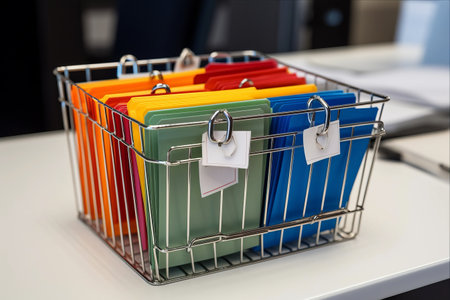 A visually striking arrangement of vibrant office folders displaying various colors, showcasing an efficient and organized workspace ideal for business settings.