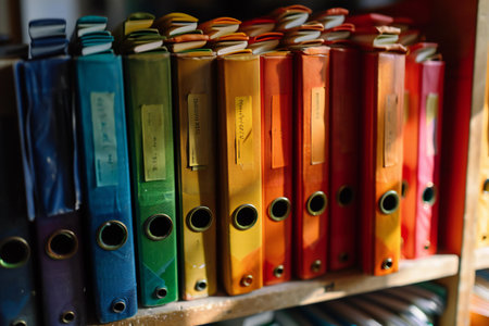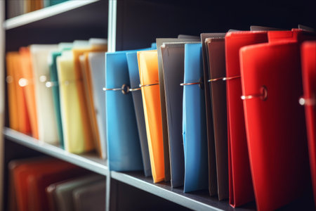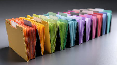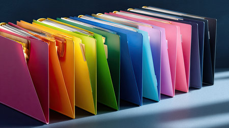 A vibrant collection of colorful folders organized in a neat row, ideal for office or school settings. This image captures a modern approach to document storage and organization, showcasing a spectrum of colors that add a cheerful touch to any workspace.