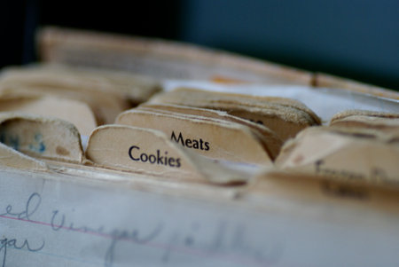A closeup shot of a vintage recipe box with labeled tabs