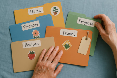 Organized hands sorting colorful folders labeled home finances recipes travel projects on blue desk for personal management.