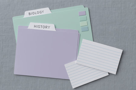 Pastel colored folders labeled biology and history with blank index cards for organized studying and academic material arrangement.