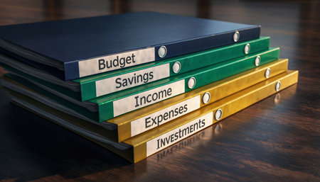 Professional office organization featuring five color-coded ring binders labeled with essential financial terms. Perfect for business planning, accounting services, and financial literacy content..