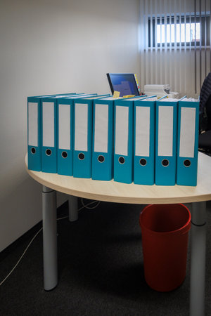 many turquoise folders stand on a desk in office