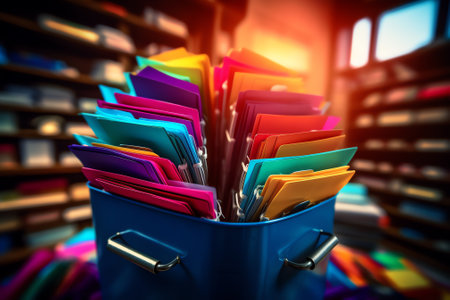 A vibrant display of neatly arranged file folders in various colors showcases effective document organization for a productive office environment, enhancing efficiency in task management.