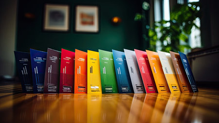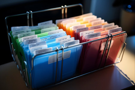 The image features a row of upright file folders in diverse colors, each labeled with numbers. The composition showcases variations in hues, including red, blue, and white, with contrasting text. The photograph uses overhead lighting and presents a studio-like environment, suitable for various business or design purposes.