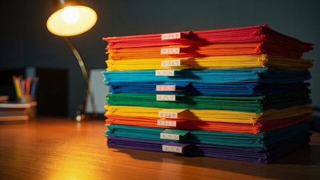 A vibrant rainbow stack of labeled papers and documents sits illuminated by a desk lamp on a warm, wooden desk. This image showcases excellent organization through a color-coded filing system, perfect for visualizing office paperwork management. The colorful and bright arrangement of files and labels suggests efficient filing and archiving. Ideal for illustrating concepts in business, education, study, or any project emphasizing workspace order and administrative efficiency.