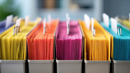 A vibrant array of hanging file folders neatly arranged in a row, showcasing diverse colors and textures in a professional office setting. Ideal for themes of organization and efficiency.