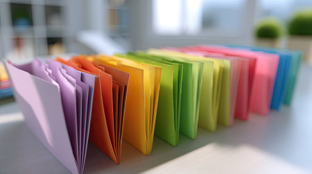 A vibrant display of colorful folders neatly arranged on a desk, illuminated by soft sunlight. This image captures a cheerful workspace promoting organization and creativity.