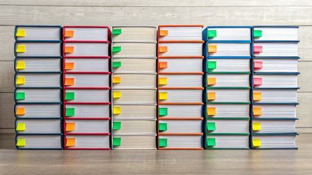 Stacks of colorful books with tabs symbolize financial compliance and legislation in organized manner for any organization