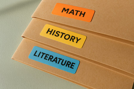 organized educational folders labeled for math history and literature on a light colored desk, study materials for school subjects.
