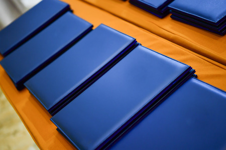 Stack of black leather notebooks on a table. Selective focus.