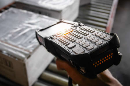 Close-up of woman scanning barcodes on parcels with scanner while working in warehouse
