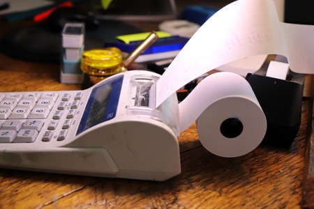 Terminal cash register machine POS for payments and long roll cash tape on blue background. Copy space for text