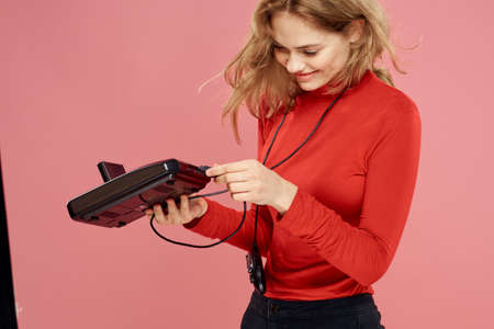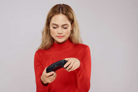 Woman with gamepad in hands playing games emotions lifestyle leisure red shirt light background