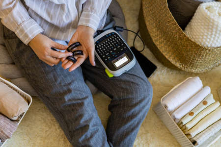Woman hands neatly folded linens and towels use Marie Kondo method with sticky label tags