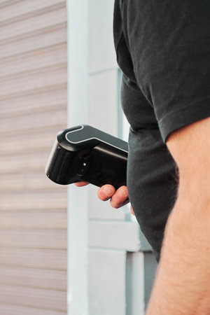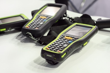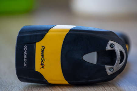 Timisoara, Romania - February 22, 2020: Close-up of a Datalogic handheld scanner on a wooden table